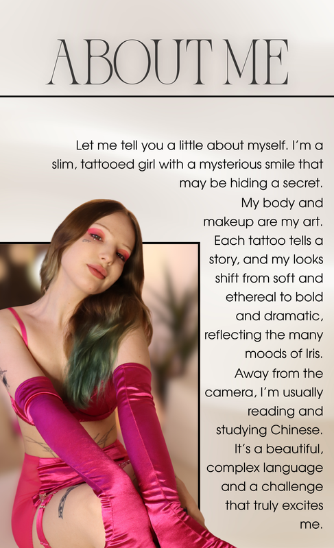 You can ASK FOR A DATE with Iris at your convenience. Everything is in your timezone, your local hours. She will receive your request and accept it if her schedule is free. You will receive a confirmation via email and you can prepare for your hot experience.
